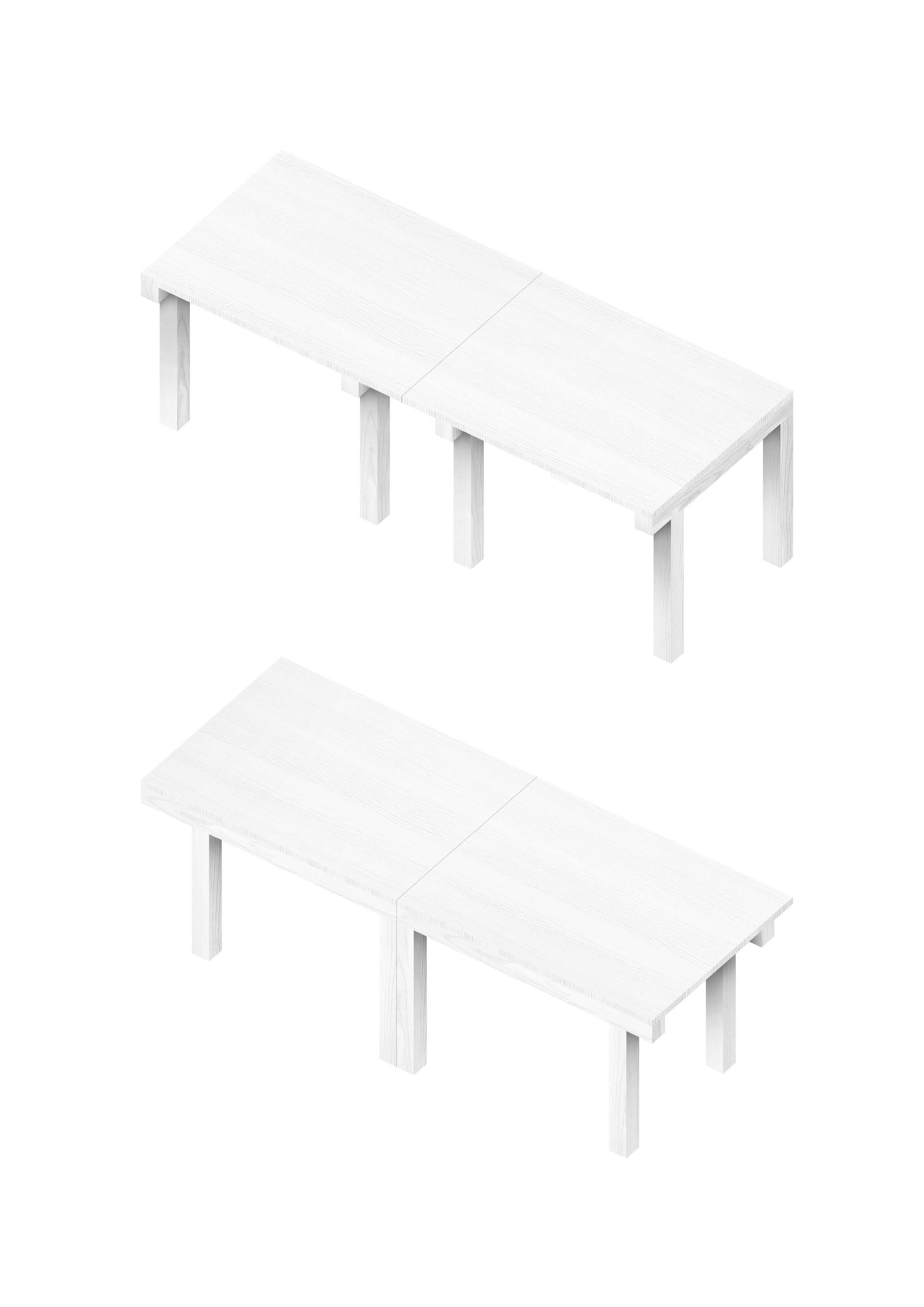 Furniture with three different layers. Open shelves for dining glasses at the top, 4 drawers for dishes and space for wine cellar in the middle, space for model making materials at the bottom.