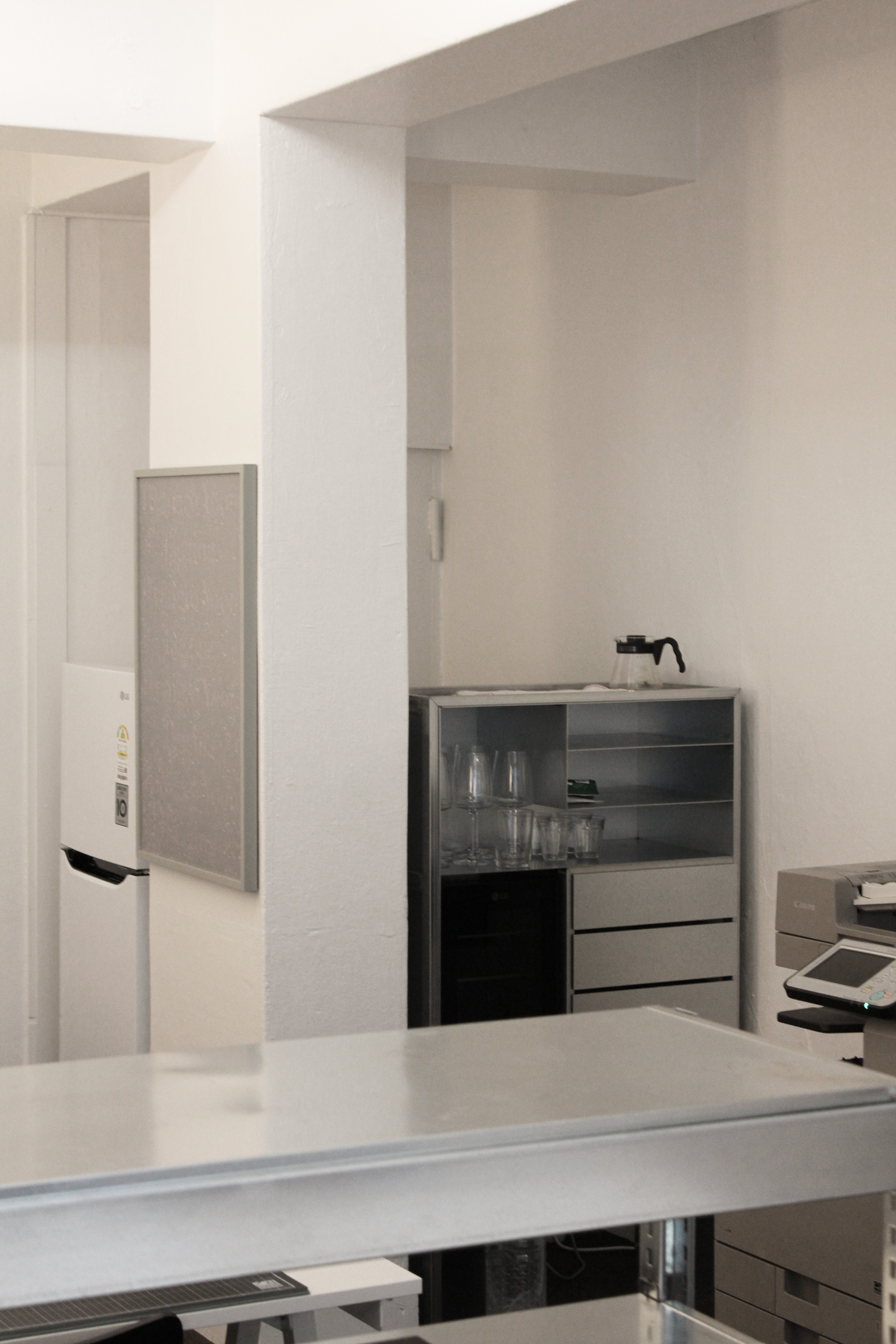 White paint dresses the space which entegrates unassembled space messed with asymmetric structure, mechanical pipes and electric lines on the wall. Nothing to do with this perfect white box. Metalic furnitures balance the materiality between sharpness and boldness, matteness and glossness.